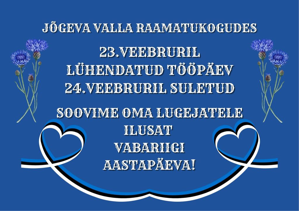 Hea lugeja, Sind ootab Jõgeva Raamatukogu RIKSWEB Laenutuse pikendamine Uudised Head raamatukogu külastaja!23.02.2026 Muinasjutuhommik ootab kuulama!02.02.2026 19. veebruaril Jõgeva linnaraamatukogus02.02.2026 Kõik uudised